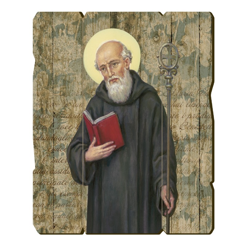 Quadro in legno di pioppo in stile vintage raffigurante San Benedetto. L'illustrazione è riprodotta direttamente su una tavola di legno di 8 millimetri di spessore. La forma anticata e lo stile dell'immagine reinterpretano in chiave moderna le tecniche di pittura dei secoli scorsi. L'effetto complessivo delle lavorazioni artigianali rendono questo quadro perfetto come dono o per essere inserito in ogni casa come segno di devozione.